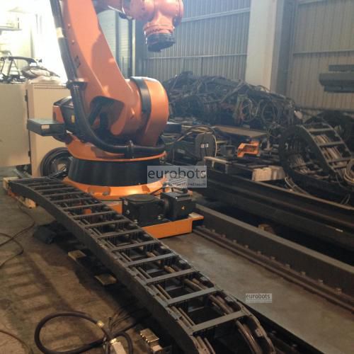 Kuka KR150-2 S2000 heavy payload industrial robot on a KL1500 7 axis linear track with lenghts ranging from 2000 to 15000 mm.